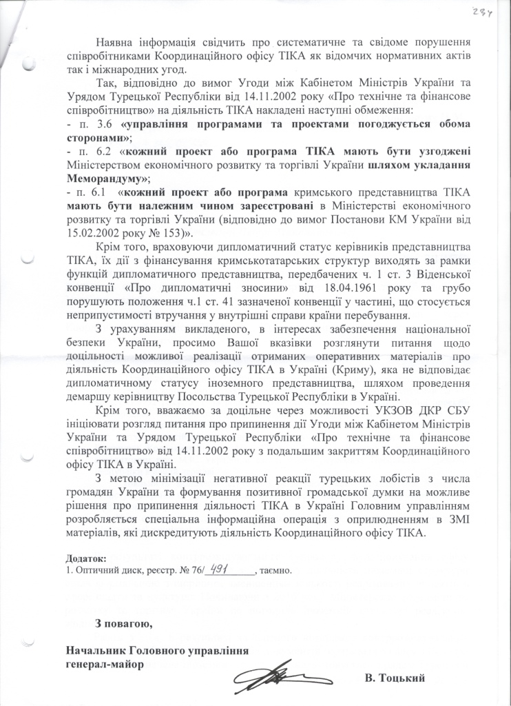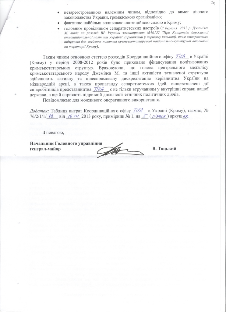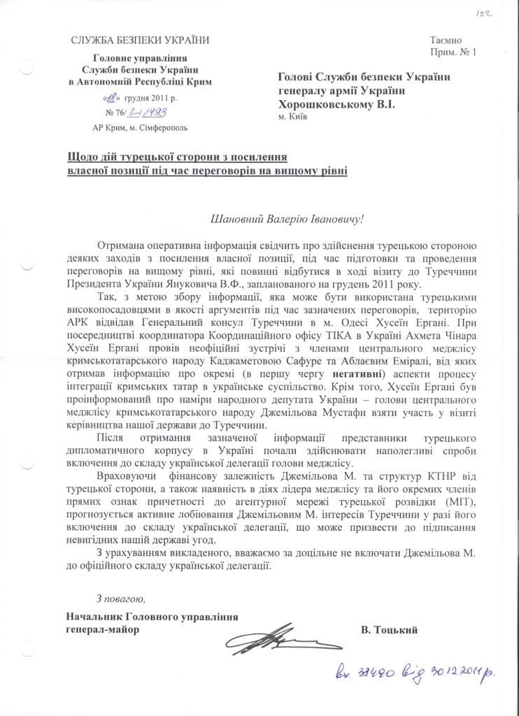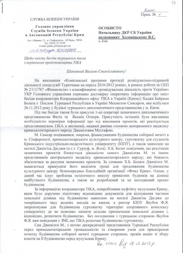 Из фотокопий документов под грифом «секретно» следует, что сотрудники СБУ на протяжении длительного времени вели наблюдение за деятельностью Джемилёва, тогда ещё главы «меджлиса», и выявили не только его связи с турецкой разведкой, но даже сделали вывод, что деятельность Джемилёва представляет угрозу национальной безопасности.