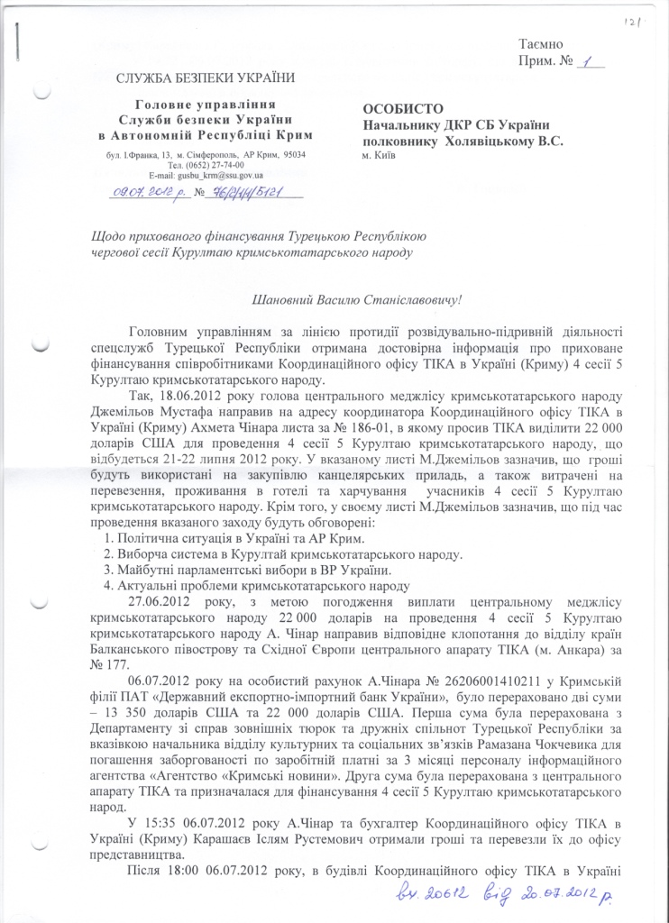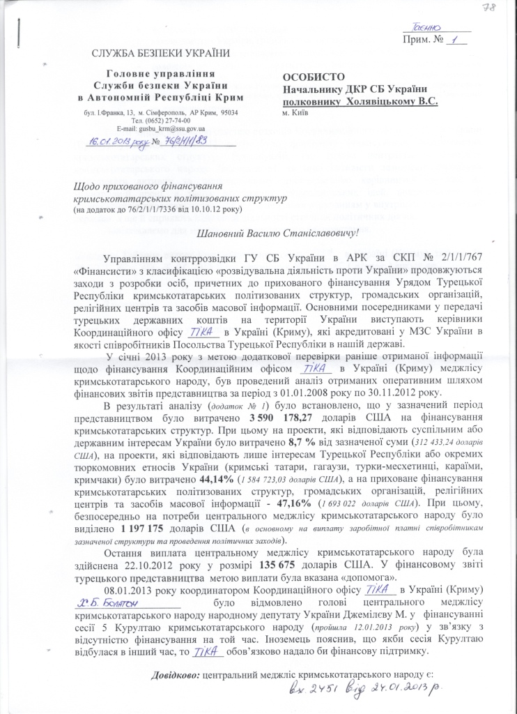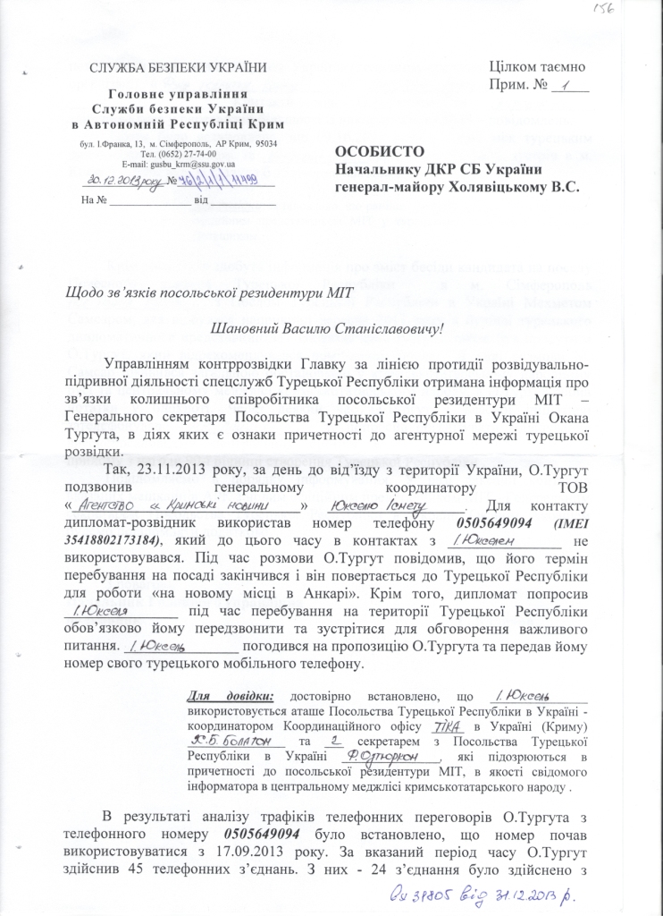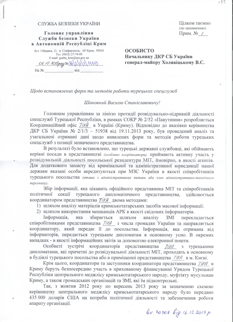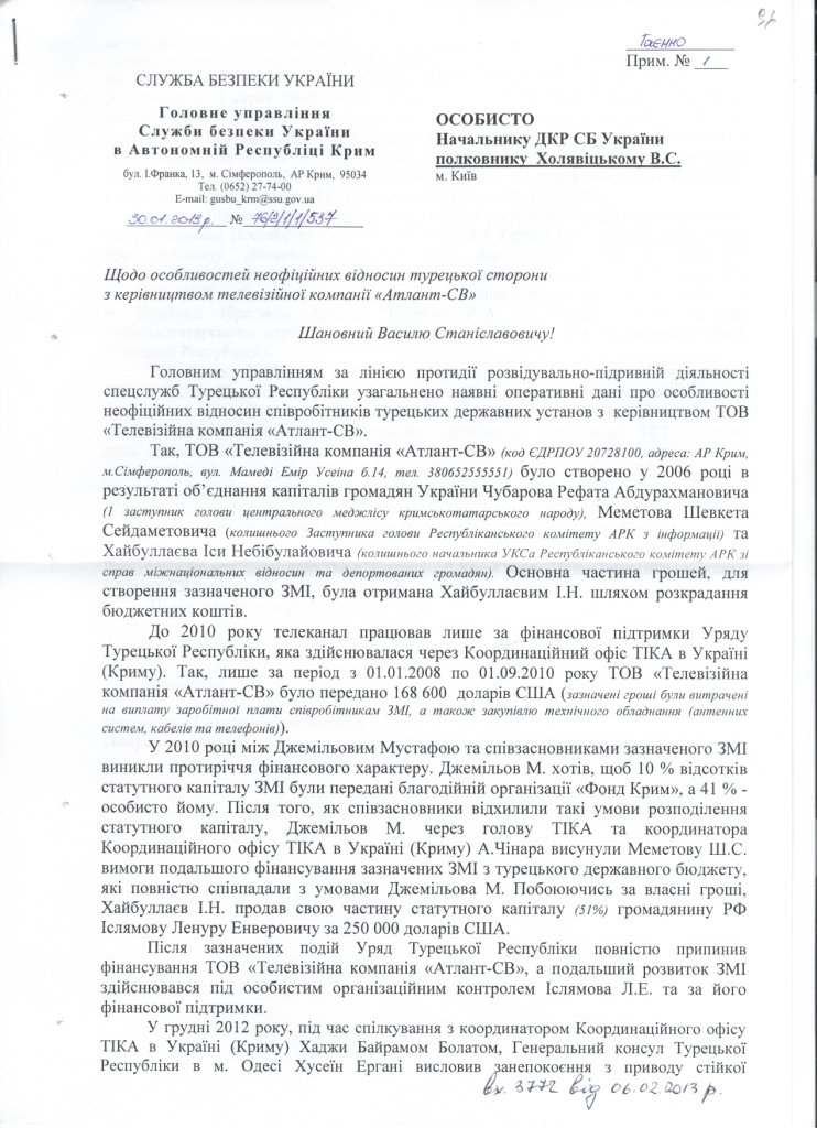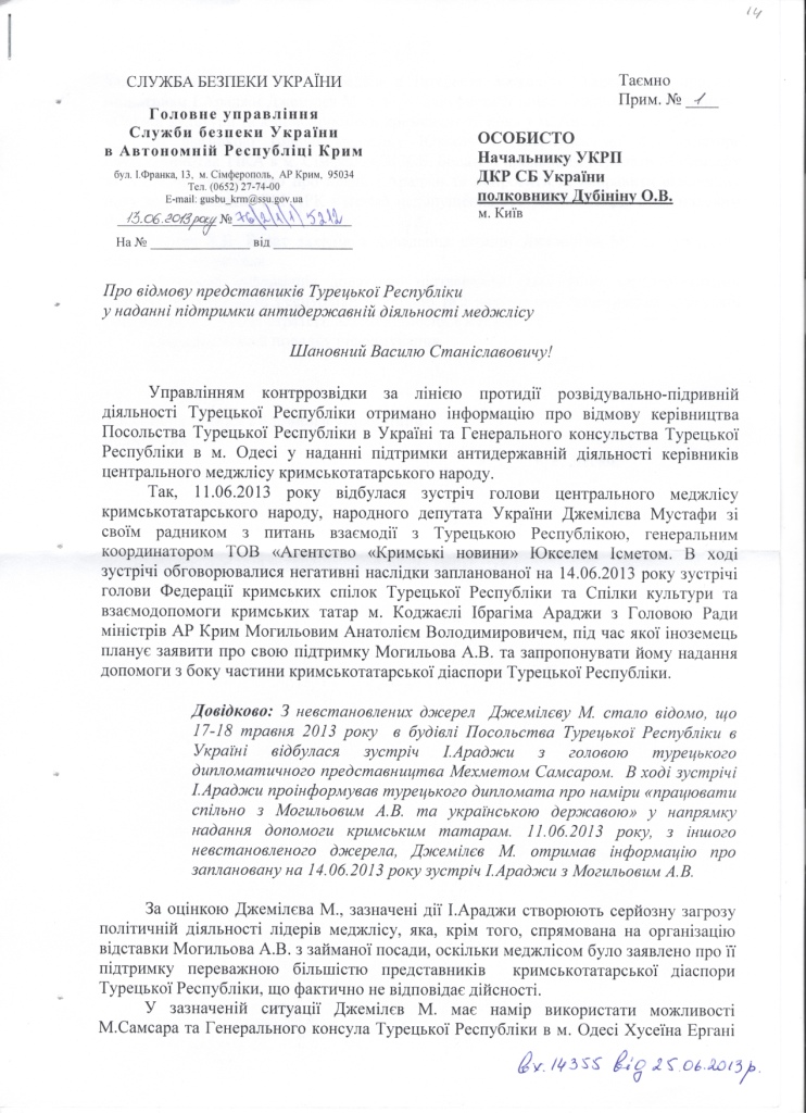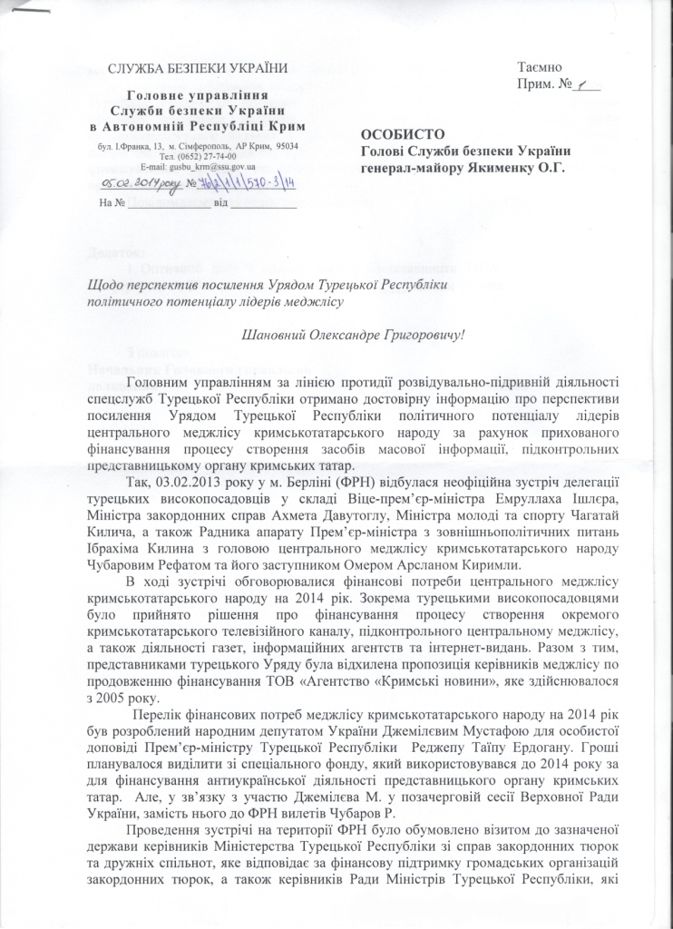 Как было написано в блоге, после передачи российским спецслужбам здания СБУ, многие документы не удалось уничтожить. Один из сотрудников службы безопасности, некий Александр передал иностранным журналистам материалы, в которых раскрывается причастность Турции к антиукраинской деятельности. Ссылка на эти материалы стала основанием для СБУ провести расследование в отношении Джемилева о его причастности к государственной измене в пользу иностранного государства. Его начали досконально проверять после того как он, совместно с лидером азербайджанской диаспоры Крыма Рагимом Гумбатовым, в 2013 году организовал блокирование Верховного Совета АРК с целью срыва утверждения законопроекта о признании геноцида армян в Турции 1915 года.