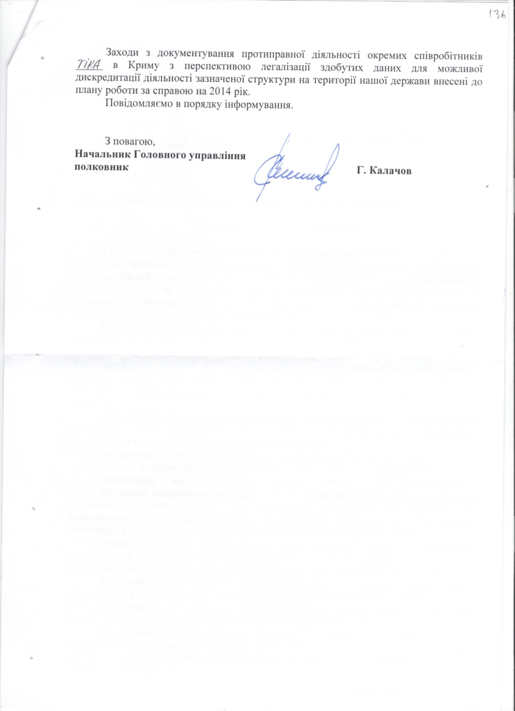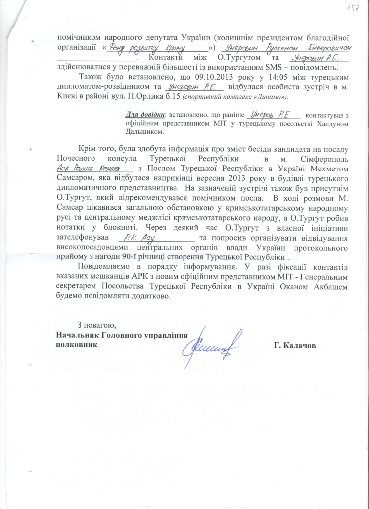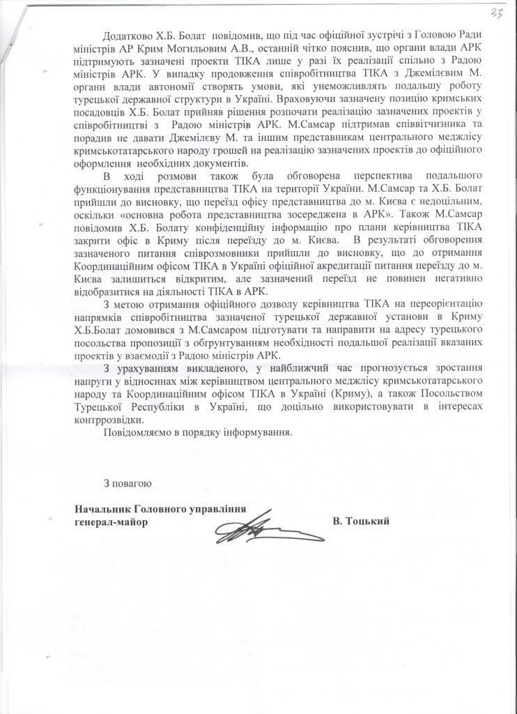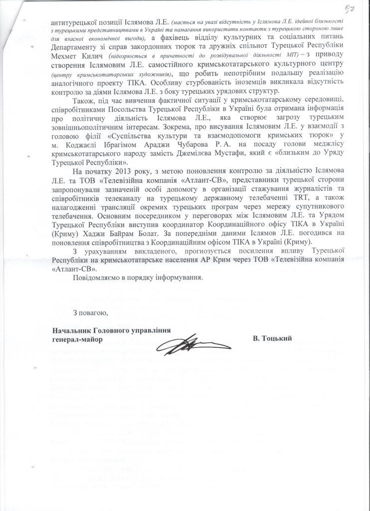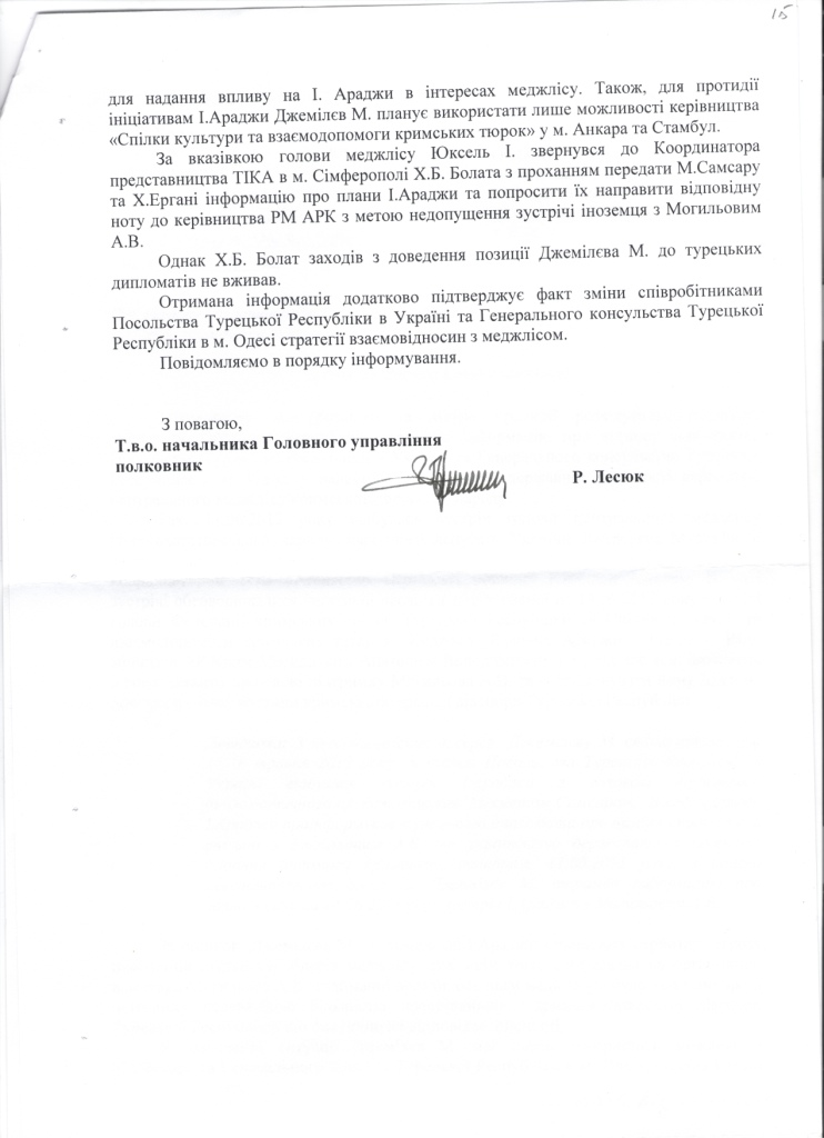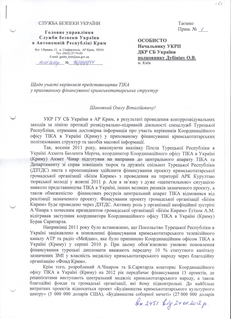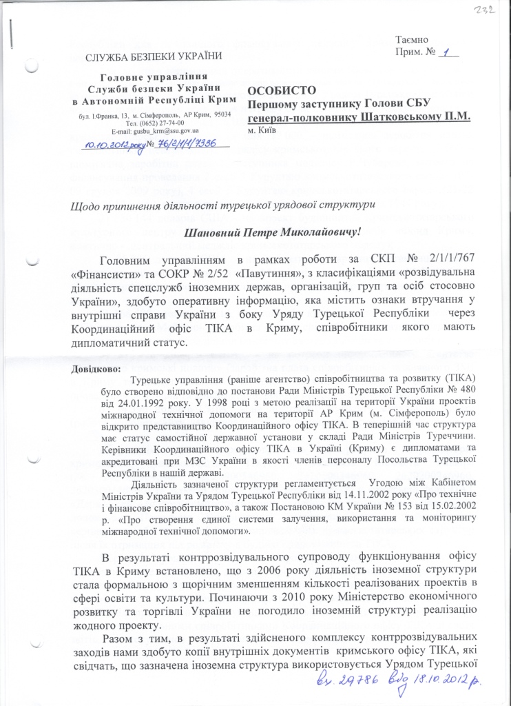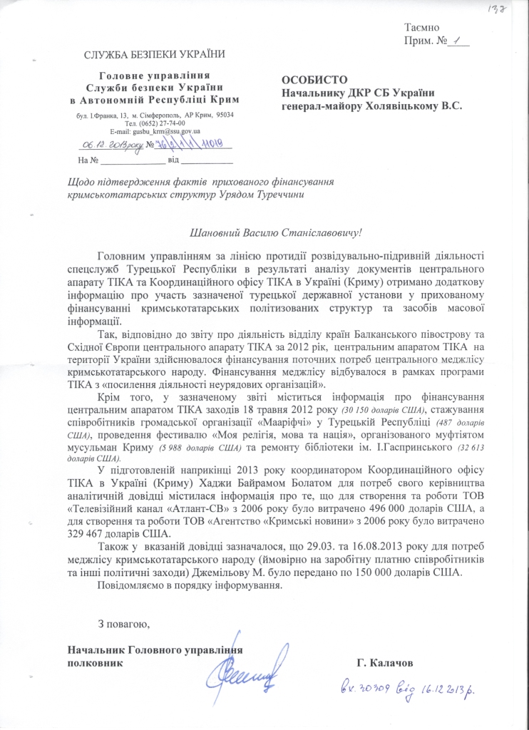 Как было написано в блоге, после передачи российским спецслужбам здания СБУ, многие документы не удалось уничтожить. Один из сотрудников службы безопасности, некий Александр передал иностранным журналистам материалы, в которых раскрывается причастность Турции к антиукраинской деятельности. Ссылка на эти материалы стала основанием для СБУ провести расследование в отношении Джемилева о его причастности к государственной измене в пользу иностранного государства. Его начали досконально проверять после того как он, совместно с лидером азербайджанской диаспоры Крыма Рагимом Гумбатовым, в 2013 году организовал блокирование Верховного Совета АРК с целью срыва утверждения законопроекта о признании геноцида армян в Турции 1915 года.