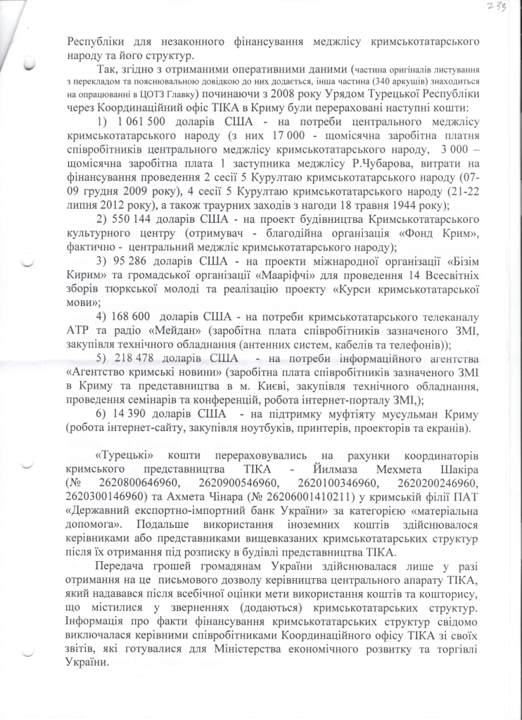 Согласно данным проведенного расследования, было выявлено, что деятельность лидера крымско-татарского народа всегда корректировалась извне посольством Турции. Для этого он постоянно встречался с послами данного государства в Киеве. Все финансовые потоки, которые шли из некой турецкой организации «ТИКА» в Меджлис крымско-татарского народа, были предназначены для политической партии Джемилева с целью вмешательства во внутренние дела украинского государства. В период с 2008 по 2012 год организацией «ТИКА» было переведено около трех миллионов долларов.