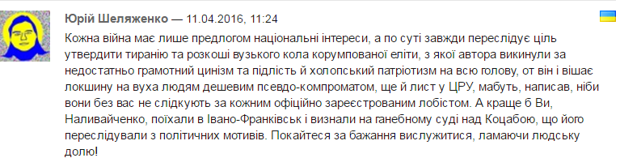 Каждая война имеет лишь предлогом национальные интересы, а по сути, всегда преследует цель утвердить тиранию узкого круга коррумпированной элиты, из круга которой автора выбросили за недостаточно грамотный цинизм и подлость и холопский патриотизм на всю голову, вот он и вешает лапшу на уши людям дешевым псевдо-компроматом, еще и письмо в ЦРУ, видимо, написал, будто они без вас не следят за каждым официально зарегистрированным лоббистом. А лучше бы Вы, Наливайченко, поехали в Ивано-Франковск и признали на позорном суде над Коцабой, что его преследовали по политическим мотивам. Покайтесь за желание выслужиться, ломая человеческую судьбу!