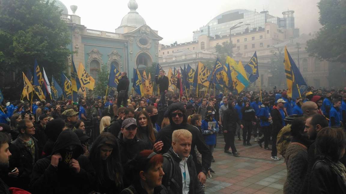 Националисты в пятницу проводят митинг у здания Рады. Многие из них в балаклавах. На площади также находятся представители запрещенного в РФ экстремистского "Правого сектора" с флагами движения. Радикалы выкрикивают националистические лозунги. Периодически они зажигают дымовые шашки и взрывают петарды.