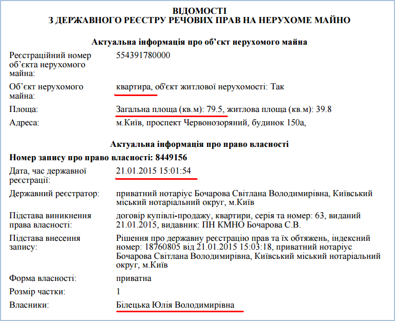 Как видим, эти сведения совпадают с данными декларации нардепа Билецкого: ФИО жены, площадь и год приобретения квартиры те же ,что и в декларации за 2015 год. Из этого мы делаем вывод, что это именно та квартира, которую нардеп указал в своей декларации.