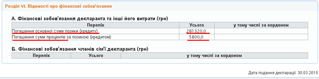 Также в 2014 году самим Андреем Билецким было погашено 281,3 тысячи гривен основной суммы и 5,8 тысячи гривен процентов по банковскому кредиту.