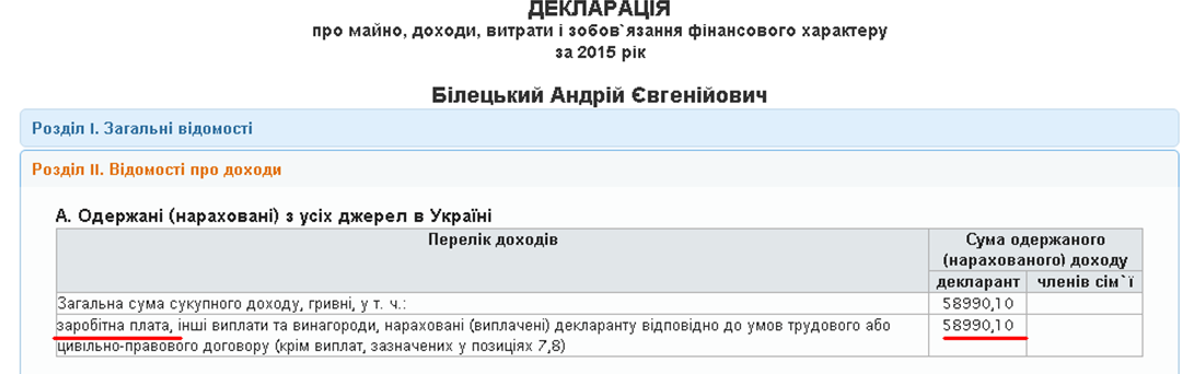 Не мог Билецкий получить недостающие средства и в начале 2015 года, поскольку отразил в своей декларации доход от депутатской зарплаты в сумме 59 тыс гривен за весь год: