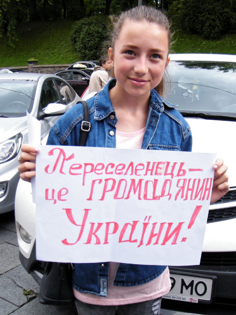 Митингующие держали плакаты «Постановление 637 – охота на переселенцев», — «Мы против дискриминации переселенцев», «СБУ должно бороться с терроризмом а не обыскивать переселенцев!», «Остановите охоту на переселенцев!», «Бессовестные чиновники – бесправные переселенцы», «Гройсман, ты видел, что принимал?», «Нет полицейскому государству!».