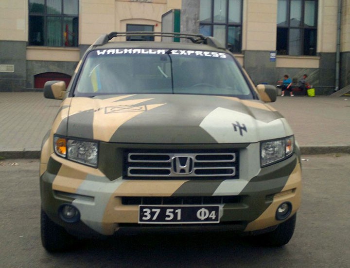 Спереди на левой части капота - нацистская символика (эмблема дивизии SS «Das Reich»). Сзади - номерной знак с надписью «Азов». Самый цимус: владелец экспресса в Ад - натуральный сын Израилев...