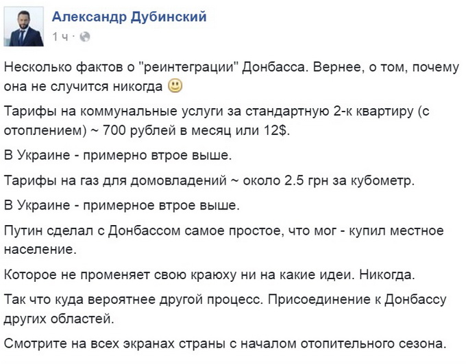 «Несколько фактов о «реинтеграции» Донбасса. Вернее, о том, почему она не случится никогда. Тарифы на коммунальные услуги за стандартную 2-к квартиру (с отоплением) – приблизительно 700 рублей в месяц или 12$. В Украине – примерно втрое выше.