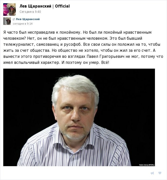 Показательно, что когда в том жу Куууве украинские фашисты убили Бузину, Порось даже глазом не моргнул, а сейчас визжит в своём твиттере, толкает тосты один за другим и требует найти и наказать виновных. А убийцы Бузины были отпущены на свободу.