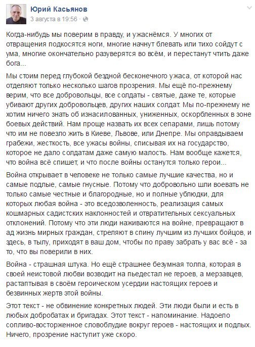 Юрий Касьянов внезапно решил сорвать покровы с того что в "Торнадо"(которые раньше служили в батальоне "Шахтерск") оказывается служили больные извращенцы и маньяки. Опять же, когда эти маньяки творили всё что хотели в Донбассе он этого не знал или предпочитал помалкивать, а сейчас прозрел.