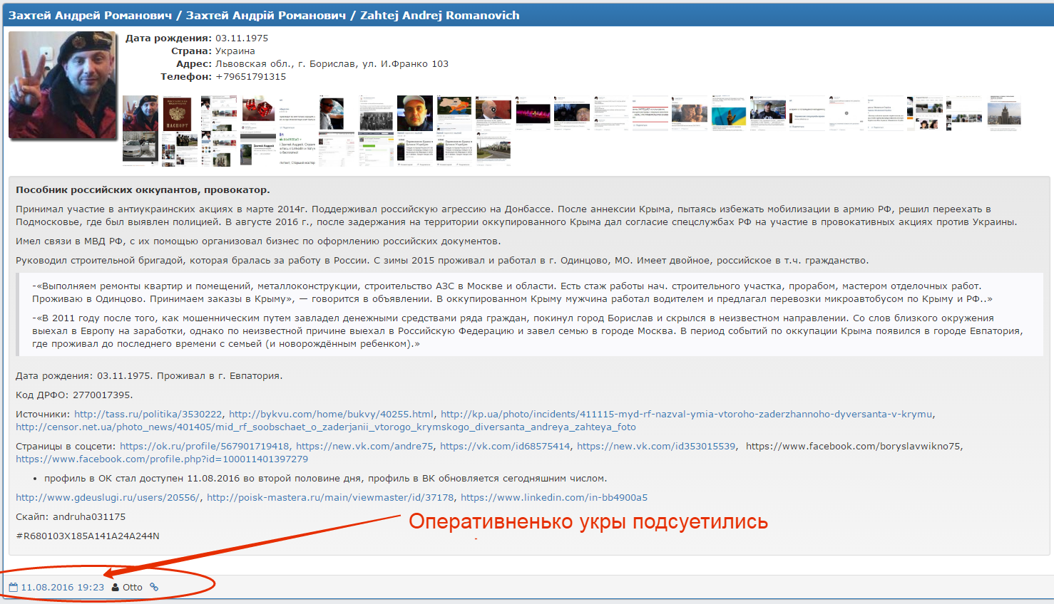 Когда я утром прочитал эту новость, улыбнулся. Очевидно в Киеве очень не понравилось, что "мировое сообщество" как-то по дежурному отнеслось к вспышке конфликта между Украиной и Россией и просто "не увидели фактов". А где бурное негодование, а где требование отпустить узников совести... Видимо, не придумав ничего лучше патроны сайта "Миротворец" решили Андрея Захтея обвинить в "антимайданизме" и почти терроризме, но ... как пособника России. Ну вы поняли зачем: