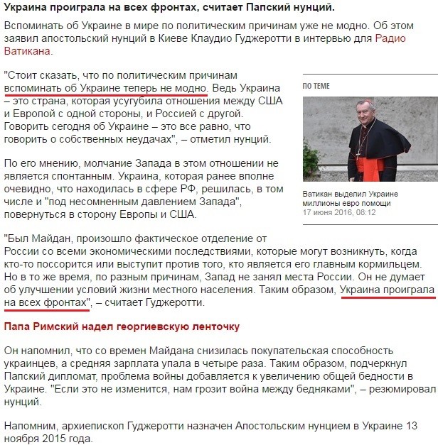 Посол (апостольский нунций) Ватикана на Украине Клаудио Гуджеротти дал откровенное интервью «Радио Ватикана», в котором рассказал об отношении к Украине на Западе и об общем положении дел в ставшей на путь евроинтеграции «Незалежной».