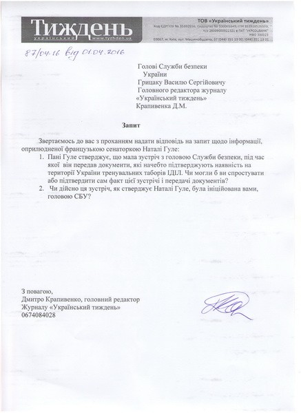1 апреля 2016 года украинские СМИ распространили информацию о том, что глава СБУ Василий Грицак передал через французского сенатора Натали Гуле сведения о лагерях ИГИЛ на Украине французским спецслужбам.