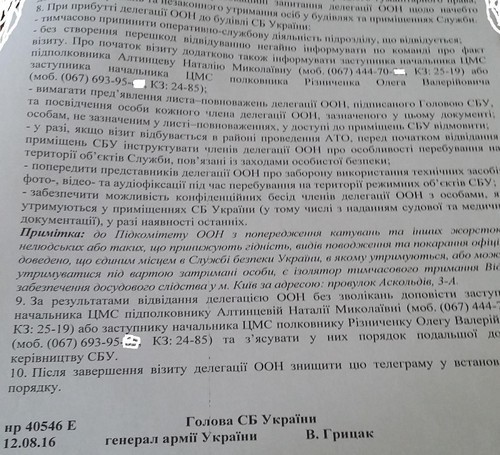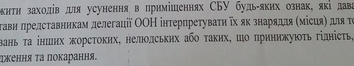 Предписывалось провести исчерпывающие мероприятия обеспечения охраны и исключения утечки информации, соблюдать режим секретности, посещения делегацией ООН помещений СБУ осуществлять исключительно в сопровождении руководителей СБУ на местах, а также «принять меры для устранения из помещений СБУ любых признаков, которые могли бы дать основания представителям делегации ООН интерпретировать их как орудия (места) проведения пыток, издевательств…».