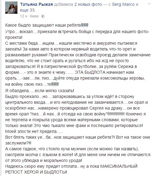 "Отправить бы эту быдлоту на побывку к оккупантам на подвал, чтоб хорошенько прочувствовал, чья это война", "Военкомат - колыбель перевоспитания, так сказать двери в праведный мир", "Вы думали "вся Страна в едином порыве..". Таких у*банов полно!", "Сергей - военный! Он правильно поступил, не замарал свой мундир об это дерьмо. А вот мужики, которые видели конфликт, могли бы и дать в дюндель, а не молча наблюдать, засунув язык в жопу! Жаль, что так много трусов среди мужиков:((", "А вам не показалось, что в Ниссан Алмера АІ7333АМ возле вокзала предмет похожий на оружие и не позвонили в СБУ?", "Частенько у таких @*банов машины самовозгараються в Западной Украине, потом они долго ещё свой грязный язык держат за пока ещё целыми зубами...", - комментируют публикацию пользователи сети.