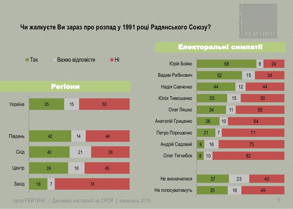 Больше всех ностальгируют по СССР респонденты, которые готовы сегодня поддержать на президентских выборах Ю.Бойко (68%), В.Рабиновича (52%) и Н.Савченко (44%). Также ностальгируют по СССР около трети сторонников Ю.Тимошенко и О.Ляшко, и четверть сторонников А.Гриценко и П.Порошенко. В то же время, меньше всего сожалеют о распаде СССР сторонники А.Садового (9%) и О.Тягнибока (8%), прежде всего, потому, что их базовый электорат — это жители Запада страны.