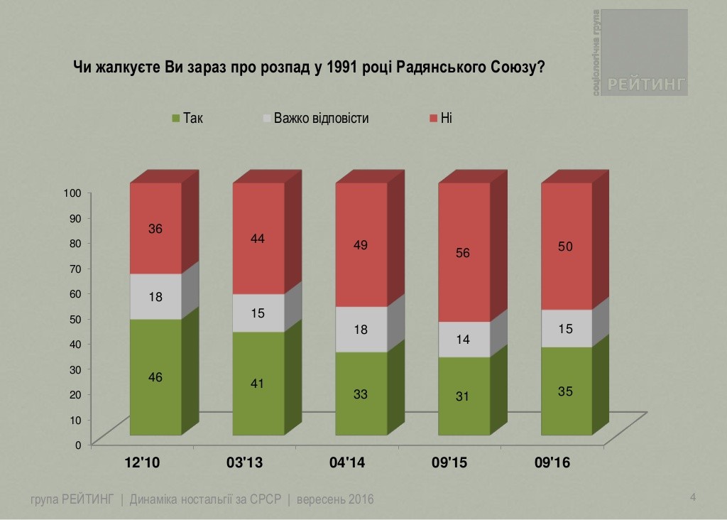 Согласно результатам исследования, проведенного Социологической группой «Рейтинг» в сентябре 2016 года, треть (35%) опрошенных сожалеют о распаде в 1991 году Советского Союза, в то же время половина - нет, 15% - не определились.