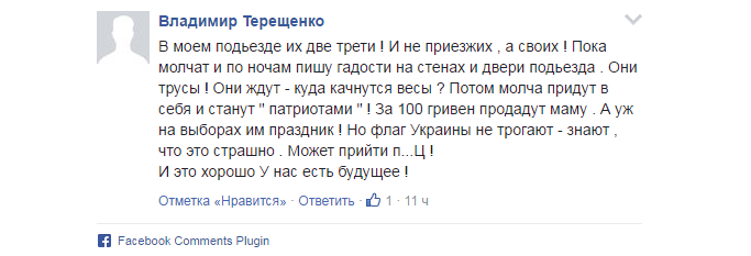 "В моем подьезде их две трети! И не приезжих, а своих! Пока молчат и по ночам пишу гадости на стенах и дверях подьезда. Они трусы! Они ждут - куда качнутся весы? Потом молча придут в себя и станут "патриотами"! За 100 гривен продадут маму. А уж на выборах им праздник! Но флаг Украины не трогают - знают, что это страшно. Может прийти п...ц! И это хорошо. У нас есть будущее!", - бодрятся адепты украинского евробратания.