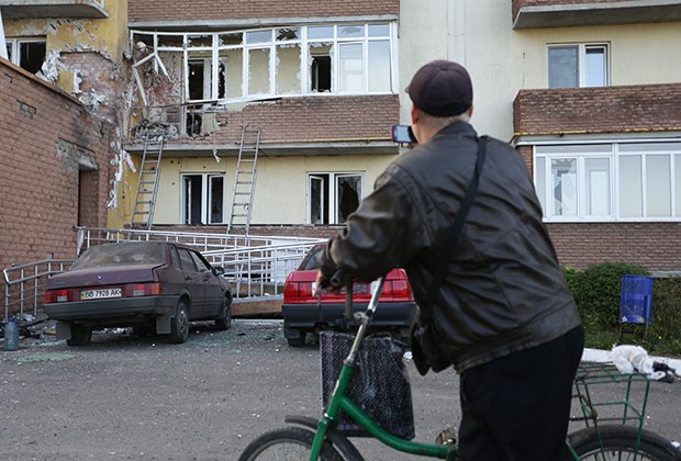 Житель Ясиноватой на территории ДНР у многоквартирного жилого дома, пострадавшего от обстрела со стороны Вооруженных сил Украины
