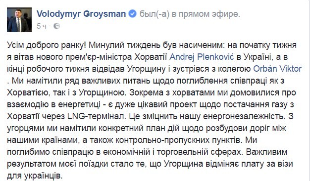 По словам премьера, намечен ряд важных вопросов касаемо углубления сотрудничества с Хорватией. В частности, заявил Гройсман, “с хорватами мы договорились о взаимодействии в энергетике – есть очень интересный проект по поставкам газа из Хорватии через LNG-терминал”.