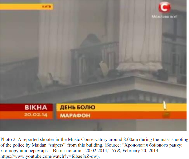 (Фото 2. Сообщается, что стрелявший со здания консерватории около 8:00 утра во время массового расстрела милиции “снайперами” Майдане из этого здания. (Источник: “Хронологія бойового ранку: хто порушив перемир'я – Вікна – новини - 20.02.2014,” СТБ, https://www.youtube.com/watch?...