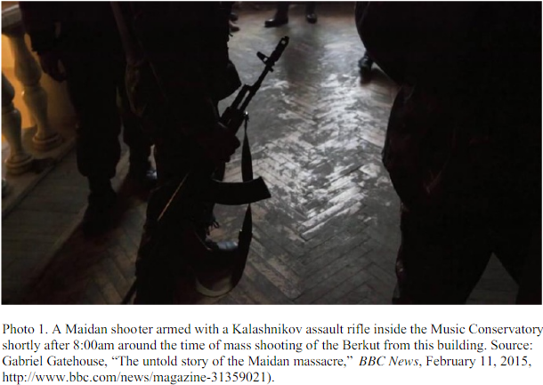 (Фото 1. Стрелок Майдана, вооруженный автоматом Калашникова внутри консерватории вскоре после 8:00 утра во время массового расстрела Беркута из этого здания. Источник: Гэбриель Гейтхаус, “Нерассказанная история бойни на Майдане”. Би-би-си, 11 февраля 2015 года, http://www.bbc.com/news/magazi...