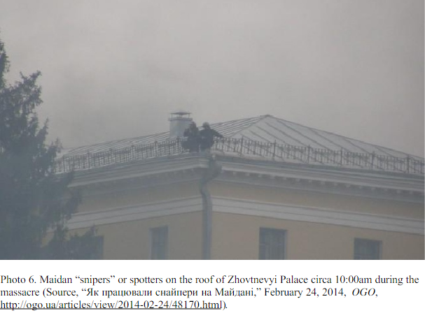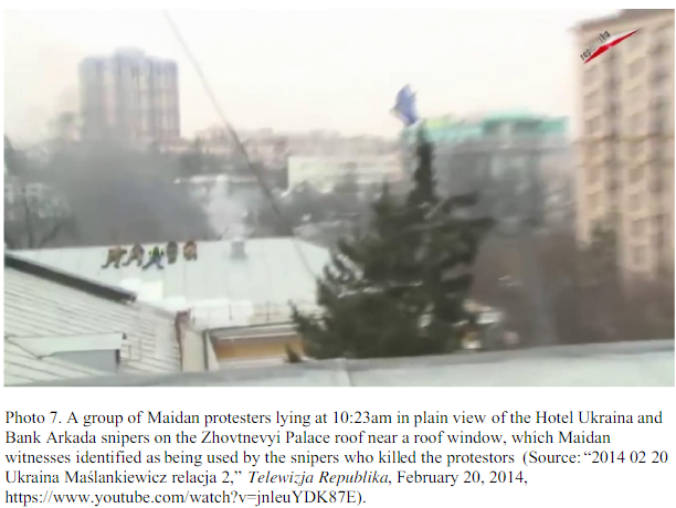 «Малоизвестные записи Spilno TV в прямом эфире на которых интернет-трансляции из отеля Украина показывают, что по крайней мере две группы вооруженных демонстрантов находились на верхних этажах отеля Украина во время бойни, и что они стреляли с АКМС и охотничьих ружей в то время, когда протестующие были убиты на Институтской. Протестующие во время этой стрельбы вокруг и сразу же после нее указали на снайперов в той части отеля Украина», — отмечает ученый.
