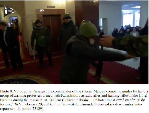 (Фото 9. Владимир Парасюк, командир специальной роты Майдан, руководит группой, прибывающих участников вооруженных автоматами Калашникова и охотничьими ружьями в гостинице Украина во время бойни в 10:19am (Источник: “ “Ukraine : Un hôtel transformé en hôpital de fortune,” Itele, февраль 20, 2014, http://www.itele.fr/monde/vide... a-kiev-les-manifestants-repoussent-la-police-73129).
