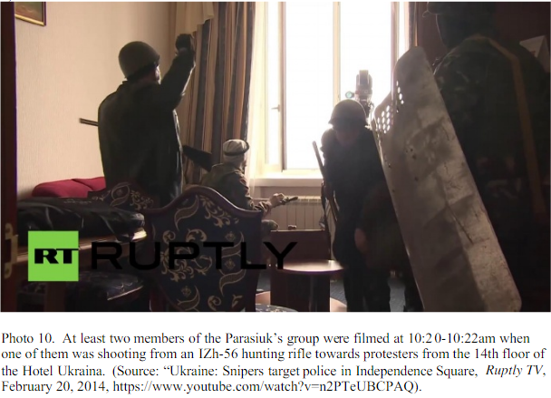 Например, в 10:35 утра этот иностранный репортер говорит, что видел стрелка, который скрывался в окне гостиницы Украина и вел огонь. Другой персонаж говорит, что в 10:31 он только что видел человека с огнестрельным оружием на 11-м этаже отеля и в 10:55, что Самооборона Майдана вооруженная автоматами Калашникова на 10-м этаже «увела» одного или двух «снайперов».