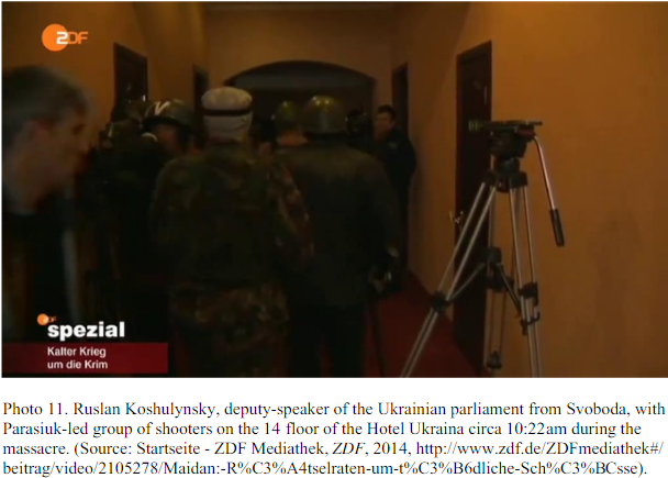 (Фото 11. Руслан Кошулинский, вице-спикер украинского парламента от "Свободы" вместе с Парасюком вели группа стрелков на 14 этаже гостиницы "Украина" около 10:22am во время бойни. (Источник: Startseite - ZDF Mediathek, ZDF, 2014, http://www.zdf.de/ZDFmediathek... beitrag/video/2105278/Maidan:-R%C3%A4tselraten-um-t%C3%B6dliche-Sch%C3%BCsse).