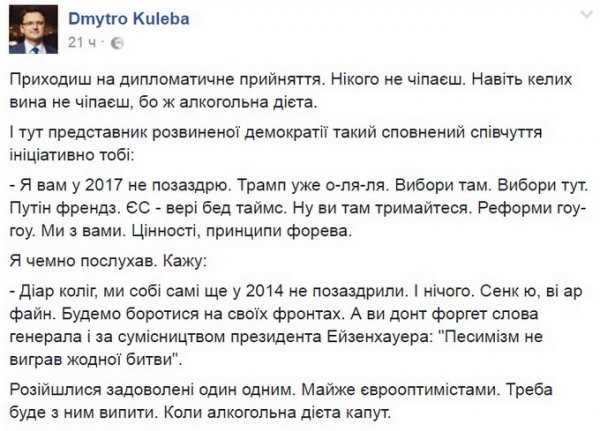 Разошлись, довольные друг другом. Почти еврооптимистами. Надо будет с ним выпить. Когда алкогольная диета капут», — пишет Кулеба.
