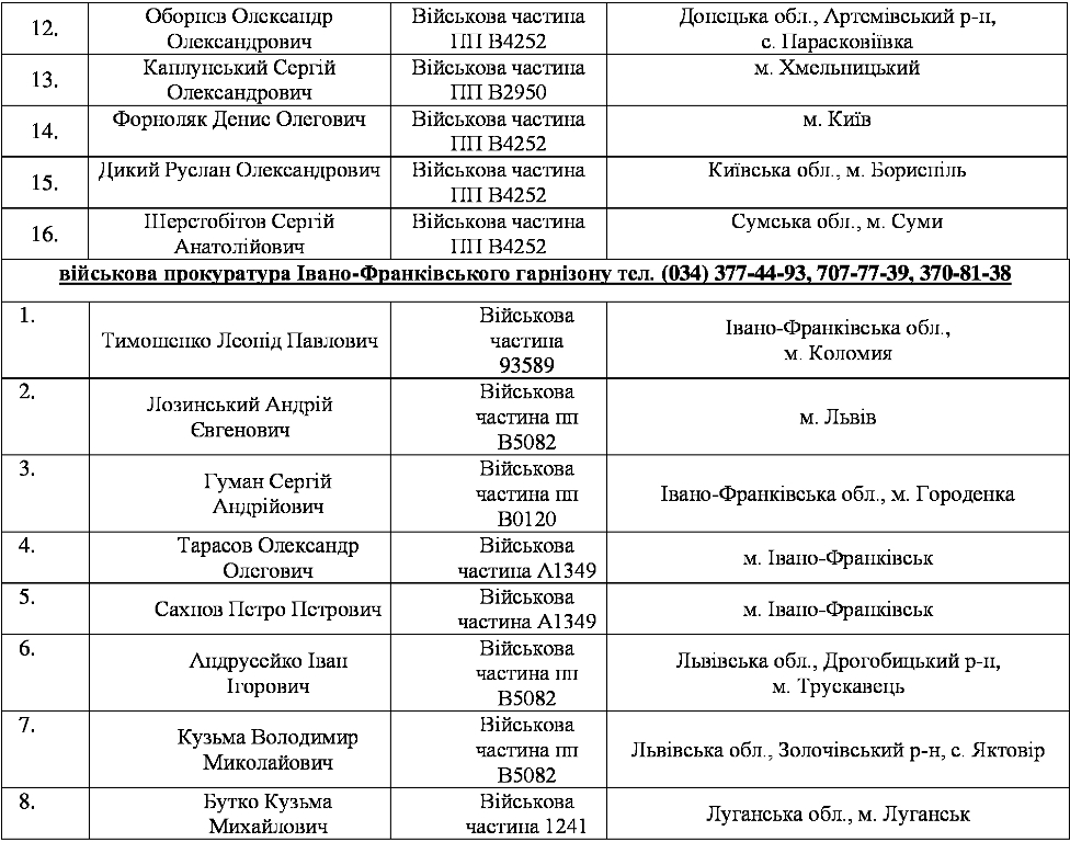 "с целью установления объективных обстоятельств и уважительности причин оставления воинских частей и мест службы обращаемся к гражданам с просьбой помочь установить местонахождение следующих лиц. С возникшими вопросами или любой информацией, которая поможет в установлении указанных обстоятельств, просим обращаться в военные прокуратуры гарнизонов Западного региона Украины по указанным в таблице телефонам.