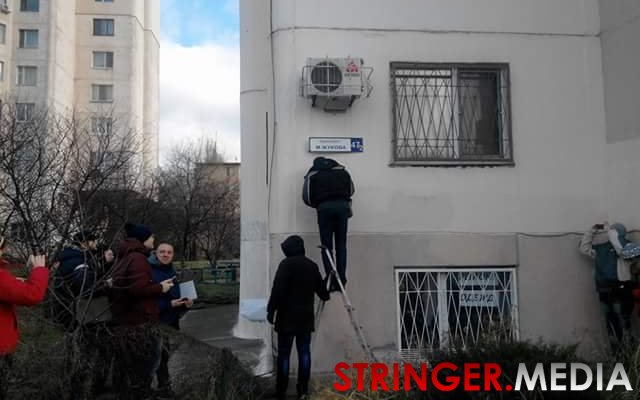 «Сегодня, 29-го декабря, представители партий «Свобода», «Сила людей» и «Народный Рух Украины» решили заняться заменой табличек проспекта Маршала Жукова и улицы Ленинградской. Так, с домов проспекта Маршала Жукова и улицы Ленинградской были демонтированы старые таблички. Отныне на указанных домах появились таблички с новыми названиями – «проспект Небесной Сотни» и «улица Александра Кутузакия», — говорится в сообщении.