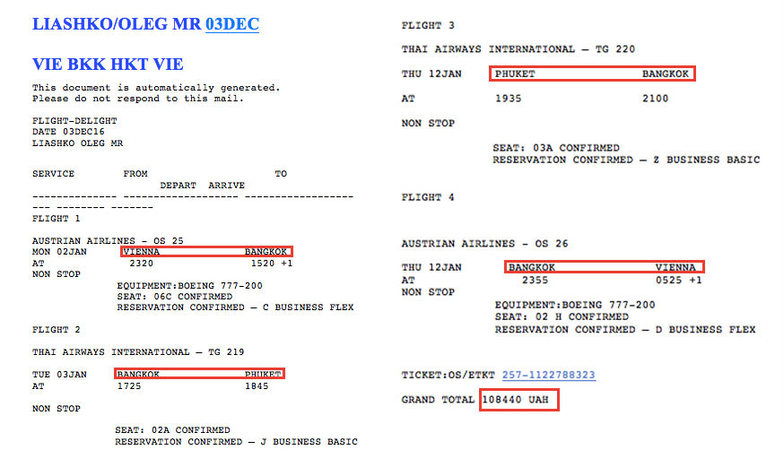 «Ночью со 2 на 3 января, а точнее в 23.20 лидер Радикальной партии Олег Ляшко ступил на борт самолета, который умчал его из города Вена в солнечный Таиланд. В Вену Ляшко прибыл накануне из Киева. Зимние каникулы политик проведет со своим заместителем по Радикальной партии и кумом Юрием Сухиным. Пункт их следования — остров Пукет. Этот курорт известен своими пляжами с белым песком, разрывными дискотеками, а также различного рода плотскими утехами», — утверждает издание.