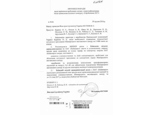 В документе идет речь о том, что Нацкомиссии по госрегулированию в сферах энергетики и коммунальных услуг (НКРЭКУ), а также КГГА и «Киевэнерго» рекомендуется принять меры по включению в тариф на электроэнергию трат, связанных с ремонтом электроустановок и линий электропередач для увеличения мощности электросетей МВЦ, а также с закупкой трансформаторных подстанций мощностью 0,4 кВ.