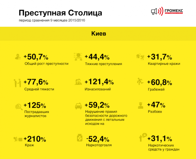 Киев лидирует и по количеству зарегистрированных похищений людей. За 9 месяцев 2016 года рост похищений в Шевченковском районе составил 600%, в Подольском – 400%, в Святошинском – 300%. Правоохранителями раскрываются только 2 из 10 правонарушений.