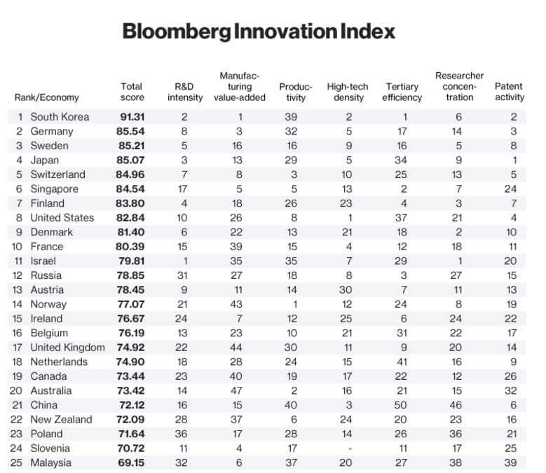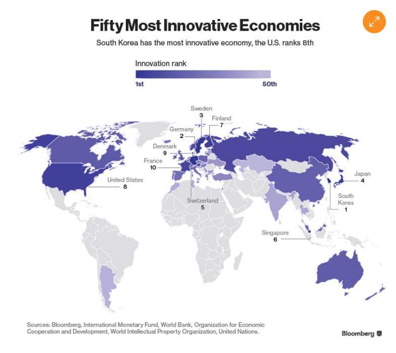 Украина попала в пятидесятку наиболее инновационных экономик мира, заняв 41 место. Соответствующий рейтинг составило авторитетное издание Bloomberg. Первое место с показателем 91,31 пункта заняла Южная Корея, за ней расположились Германия, Швеция, Япония и Швейцария. США оказались на восьмом месте в рейтинге, Россия – 12, Китай – 21.
