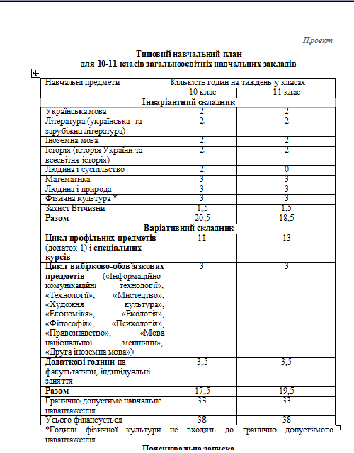 Также объединяют в один курс историю Украины и всемирную историю (в сумме - 2 часа в неделю против 2,5 часов на два предмета в сумме ранее), а также украинскую и мировую литературу (тоже два часа в сумме против четырёх часов ранее). Зато увеличивается время на занятия физкультурой: 3 часа в неделю вместо двух.
