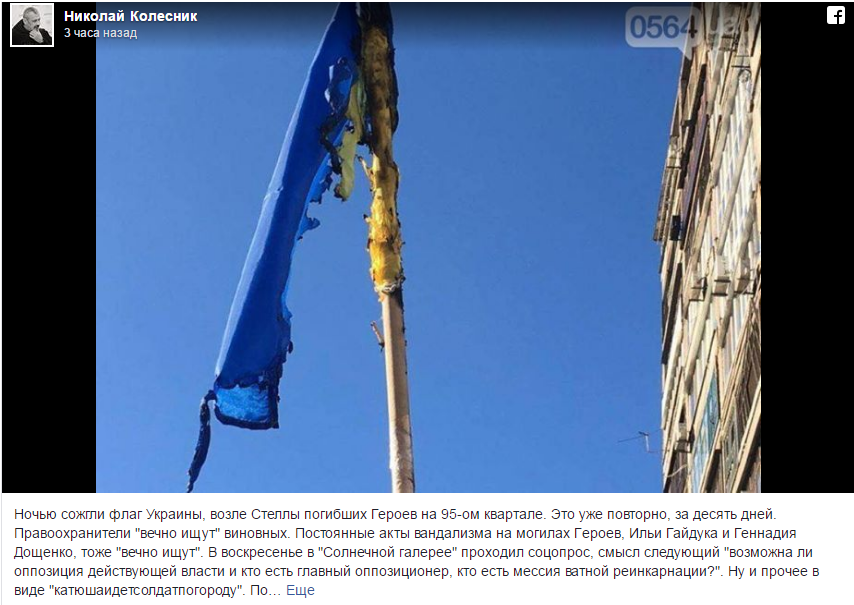 "Ночью сожгли флаг Украины, возле Стеллы погибших героев на 95-м квартале. Это уже повторно, за 10 дней",