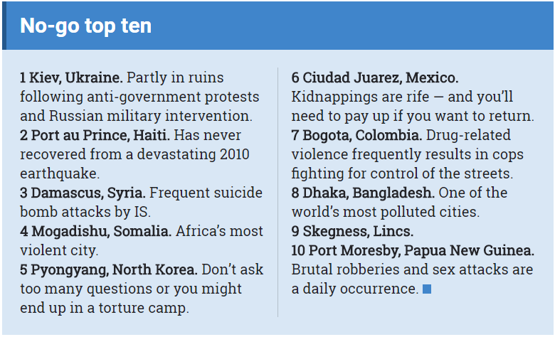 Британский Скегнесс портал назвал худшим местом для проведения каникул, бангладешская Дакка признана самым грязным городом мира а в Порт-Морсби (Папуа-Новая Гвинея), по мнению портала, лучше не ехать из-за ежедневных грабежей и изнасилований