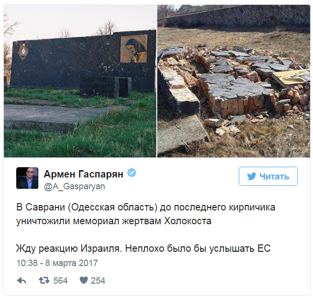 В Саврани Одесской области полностью уничтожили памятник жертвам Холокоста.