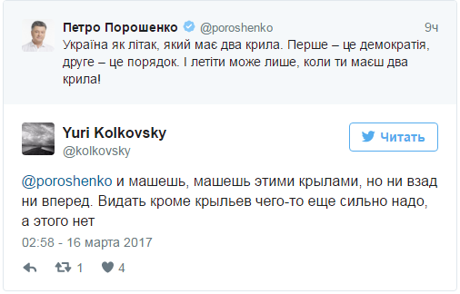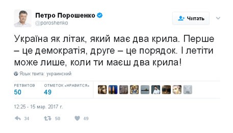 "Украина как самолет, у которого два крыла. Первое — это демократия, второе — это порядок. И лететь можно, только если есть оба крыла", — написал Порошенко.
