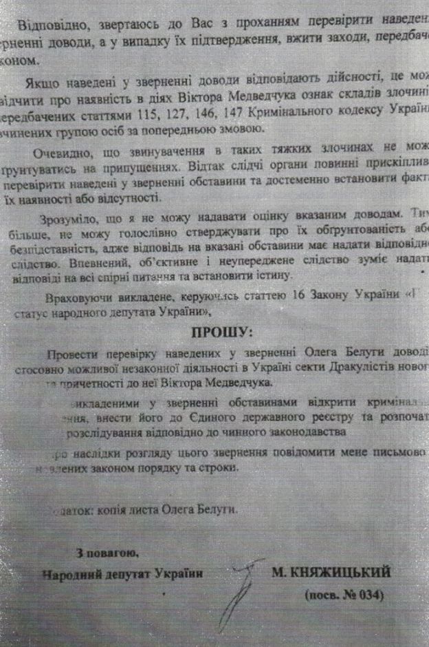 Отметим, что в депутатском обращении Княжицкого, опубликованном на сайте общественного движения «Украинский выбор», говорится, что на Украине существует секта «Дракулисты нового времени», в которой Медведчук является «культовым служителем» и занимает «сан пророка», а в ночь с субботы на воскресенье секта якобы занимается жертвоприношениями. Кроме того, утверждается, что Медведчук ежедневно по утрам натощак выпивает два-три стакана крови юношей-девственников. Источник