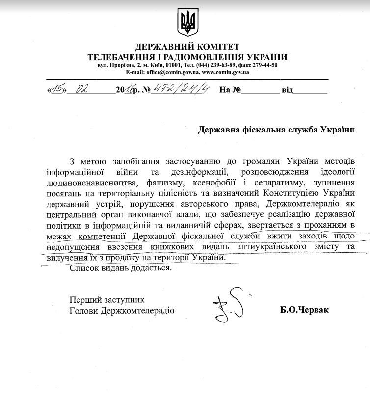 Пресс-служба Госкомтелерадио уточняет, что в соответствии с законом, нельзя ввозить в Украину издательскую продукцию, которая по своему содержанию: направлена ​​на ликвидацию независимости Украины, изменение конституционного строя насильственным путем, нарушение суверенитета и территориальной целостности государства, подрыв его безопасности, незаконный захват государственной власти. Кроме того, если продукция пропагандирует войну, совершение террористических актов, пропагандирует коммунистический или национал-социалистический тоталитарные режимы и их символику; разжигает межэтническую, расовую, религиозную вражду; посягает на права и свободы человека; пропагандирует государство-агрессора, в частности его органы власти, представителей органов власти, работников культуры и других сфер государства-агрессора, публично поддерживают оккупацию территории Украины; высмеивает государственные символы страны (герба, флага, гимна) в любом виде. Без разрешения можно ввозить издательскую продукцию в общем количестве не более 10 экземпляров. 8 декабря 2016 года Верховная Рада приняла изменения в ряд законов по поводу ограничения доступа на украинский рынок иностранной печатной продукции антиукраинского содержания №5114.