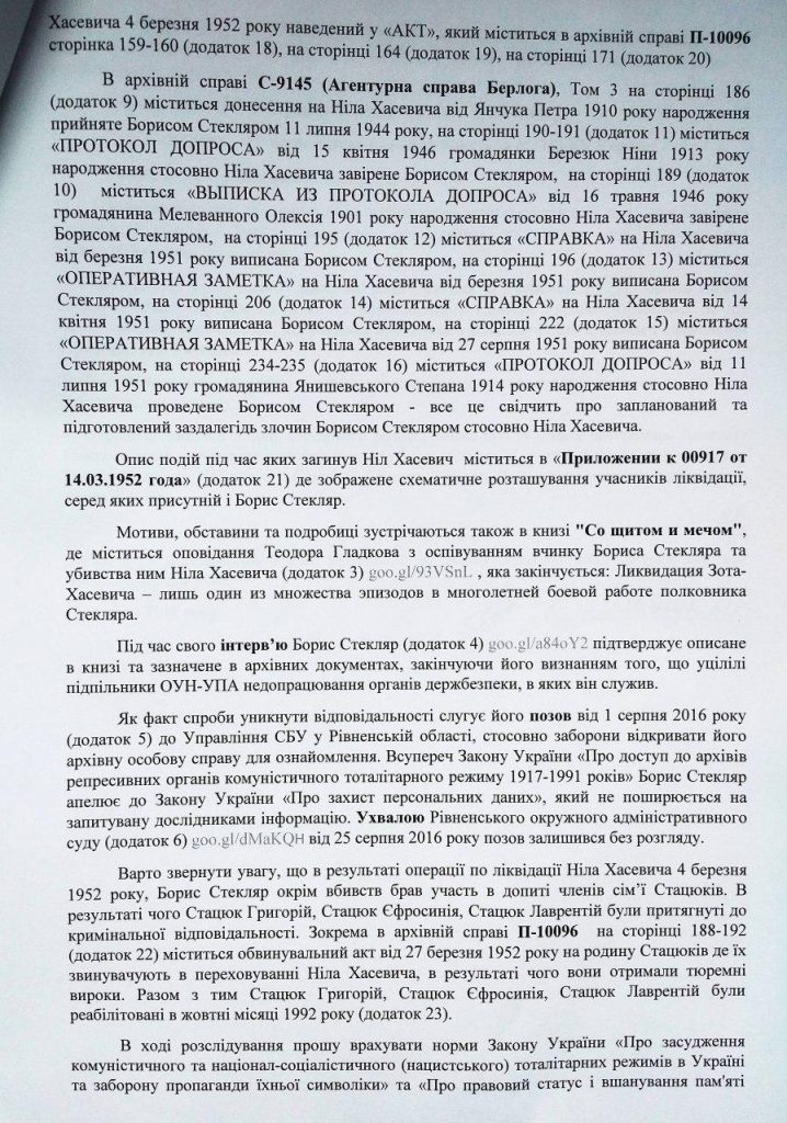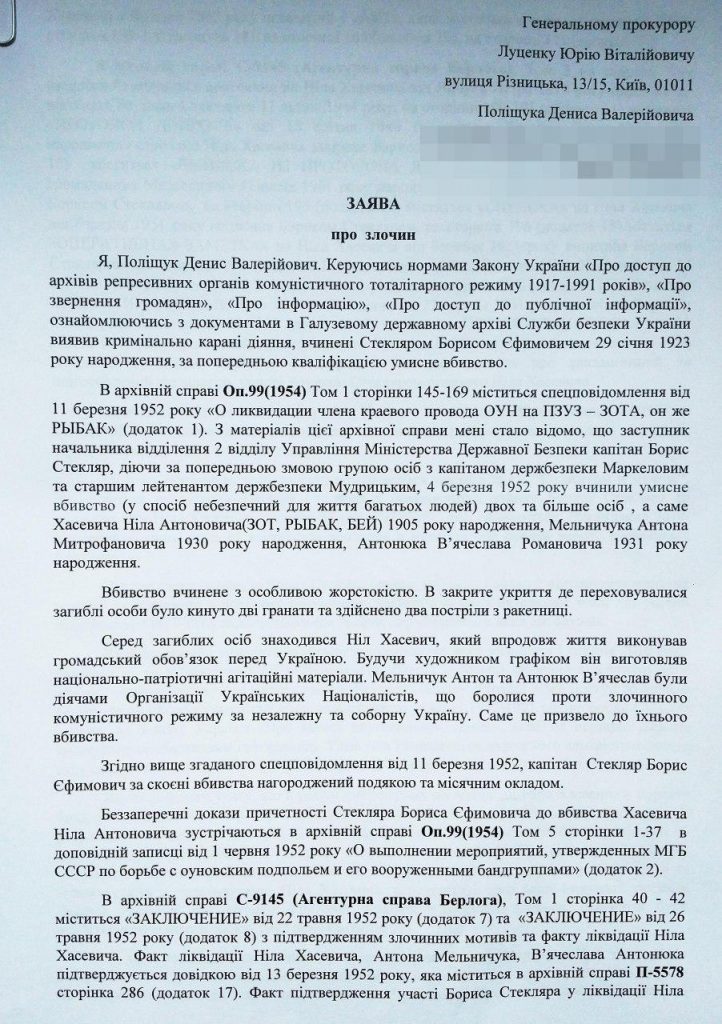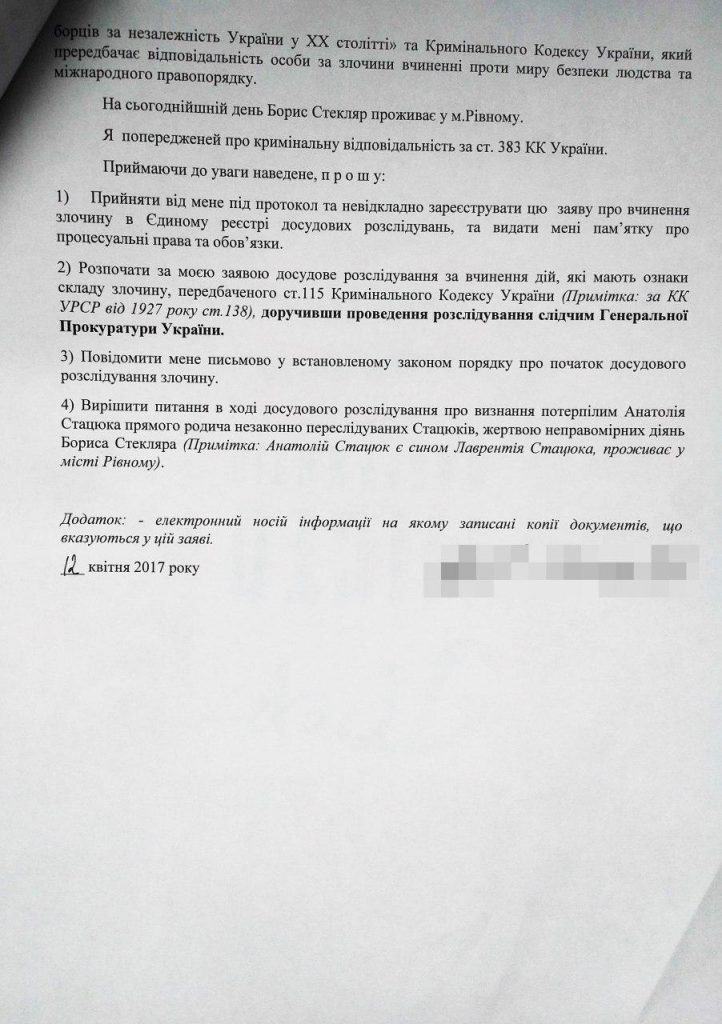 «Преступные деяния офицера госбезопасности Стекляр не имеют срока давности. Вместо привлечения к уголовной ответственности и заключения убийцы украинских патриотов, полковник КГБ получает награды и льготы, раздает интервью российским изданиям и свободно передвигается по Ровно. Национальный центр правозащиты отмечает, что несмотря на формальное осуждение тоталитарной эпохи — власть не сделала ни малейших шагов к осуждению ее представителей, порождает безнаказанность и представляет угрозу украинскому народу», — заявляет Полищук.