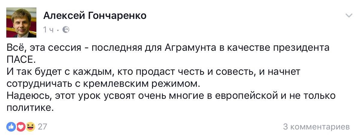 «Это настоящий разгром пророссийского лобби. Причем состоялся он не кулуарным путем, а путём публичной «порки», которая состоялась сегодня в сессионном зале. Это беспрецедентно для ПАСЕ. Впервые с 1949 года президент ПАСЕ уходит со своего поста именно так.
