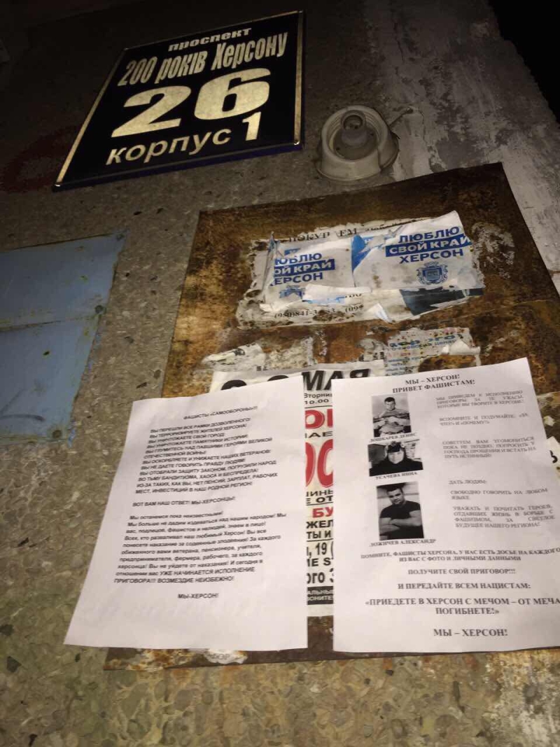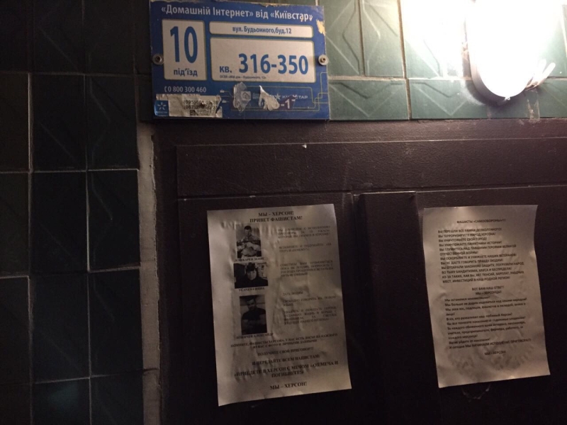 В Херсоне в микрорайоне Таврический в дни после Первомая неизвестные расклеили листовки, в которых объявили «приговор» бывшим и действующим лидерам и участникам организации «Самооборона-Херсон» Денису Лошкареву, Инне Усачовой и Александру Ложичеву. Это можно видеть на фото, присланных на редакционную почту.
