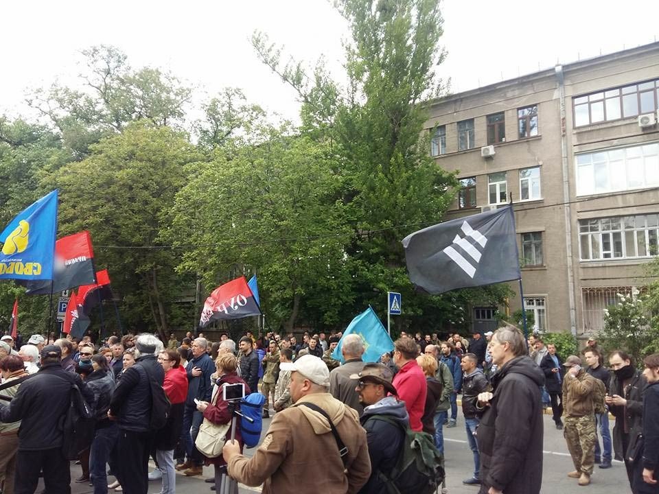 В настоящее время возле проходной министерства на улице Богомольца находятся несколько десятков человек. У некоторых из них есть красно-черные флаги с надписью ОУН*, государственные флаги Украины. Также к ним присоединились несколько боевиков «Свободы» и «Правого сектора»*, которые держат свои партийные флаги.
