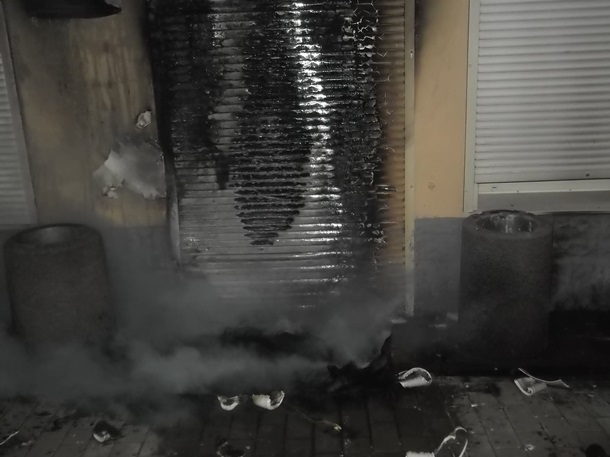 Прибыв на место вызова, пожарные установили, что горят старые автомобильные шины у входной двери помещения офиса Оппозиционного блока.