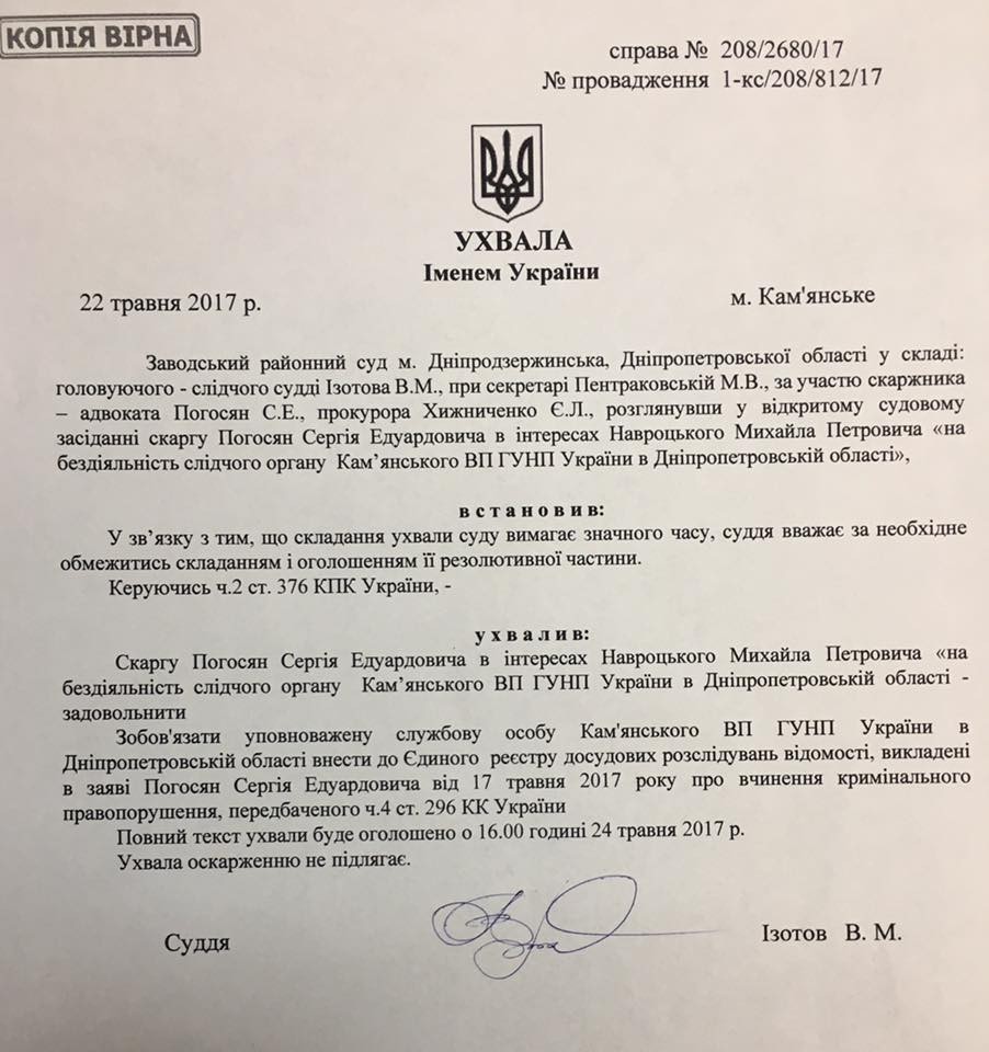 22 мая Заводской районный суд обязал полицию Каменского начать уголовное производство по факту избиения таксистом охранника народного депутата Украины Дмитрия Яроша Михаила Навроцкого. Об этом на своей странице в Facebook сообщил адвокат потерпевшего Сергей Погосян.